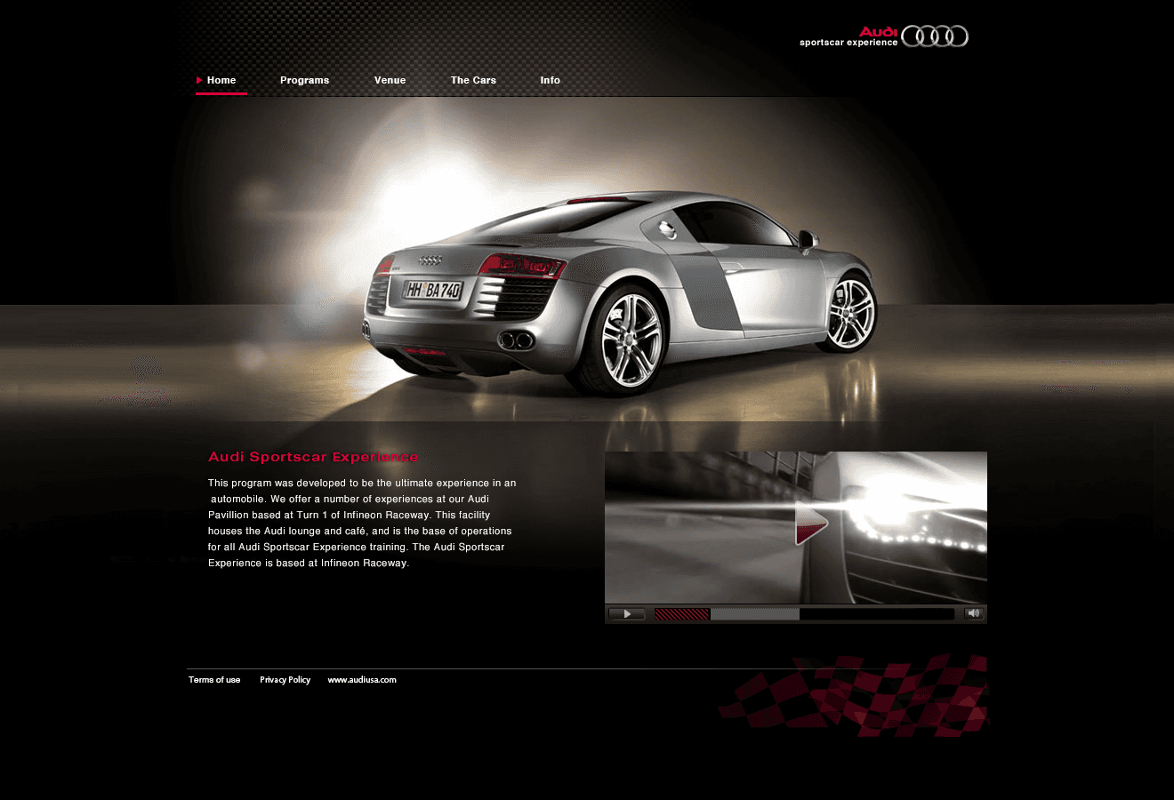 Designed all branding and marketing materials for the Audi Sports Car Experience and Jim Russell Racing School at Sonoma Raceway. Created event signage, environmental graphics, promotional materials, and the official event website. Delivered a cohesive visual system aligned with Audi brand standards across all event touch-points.