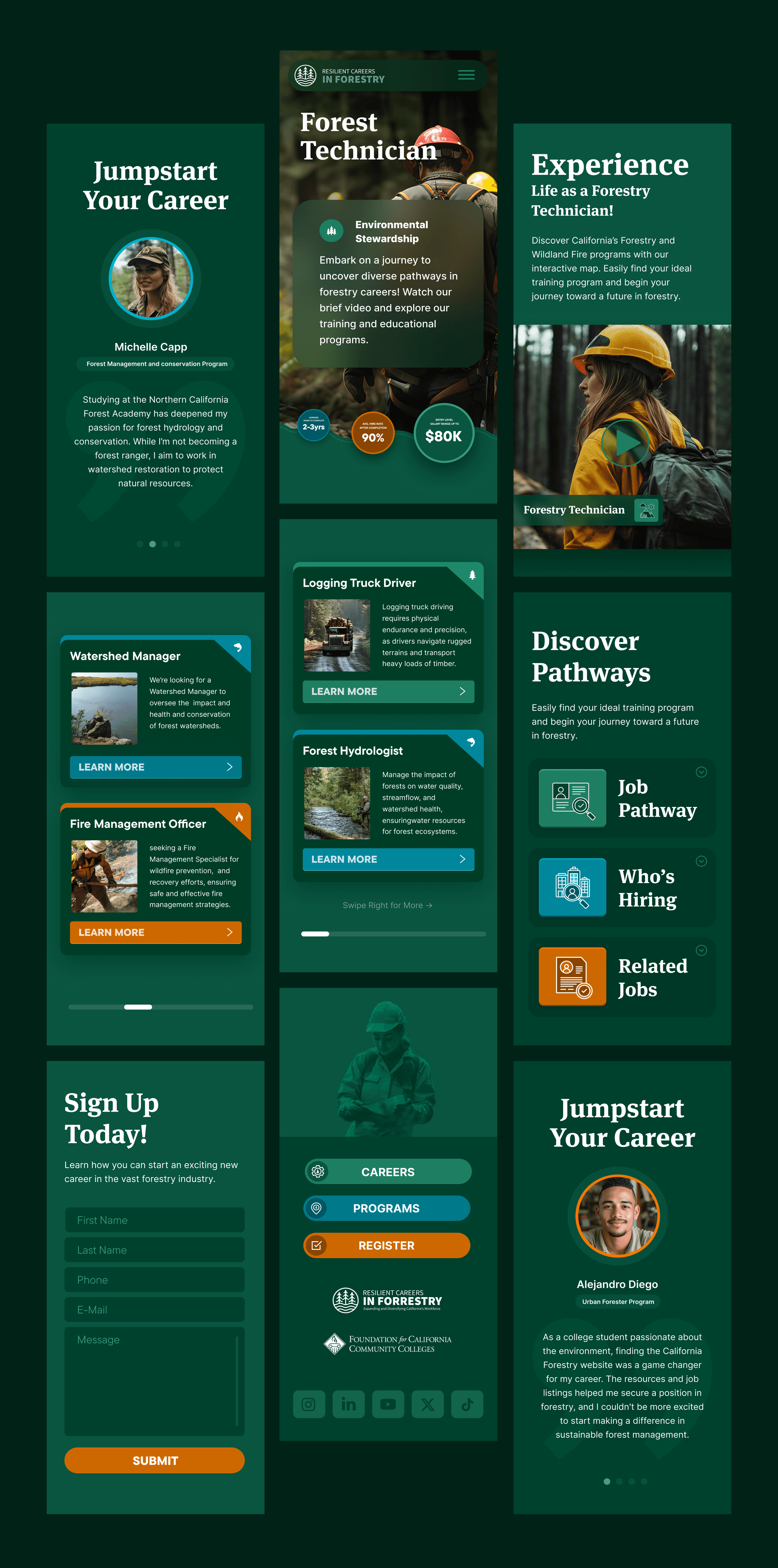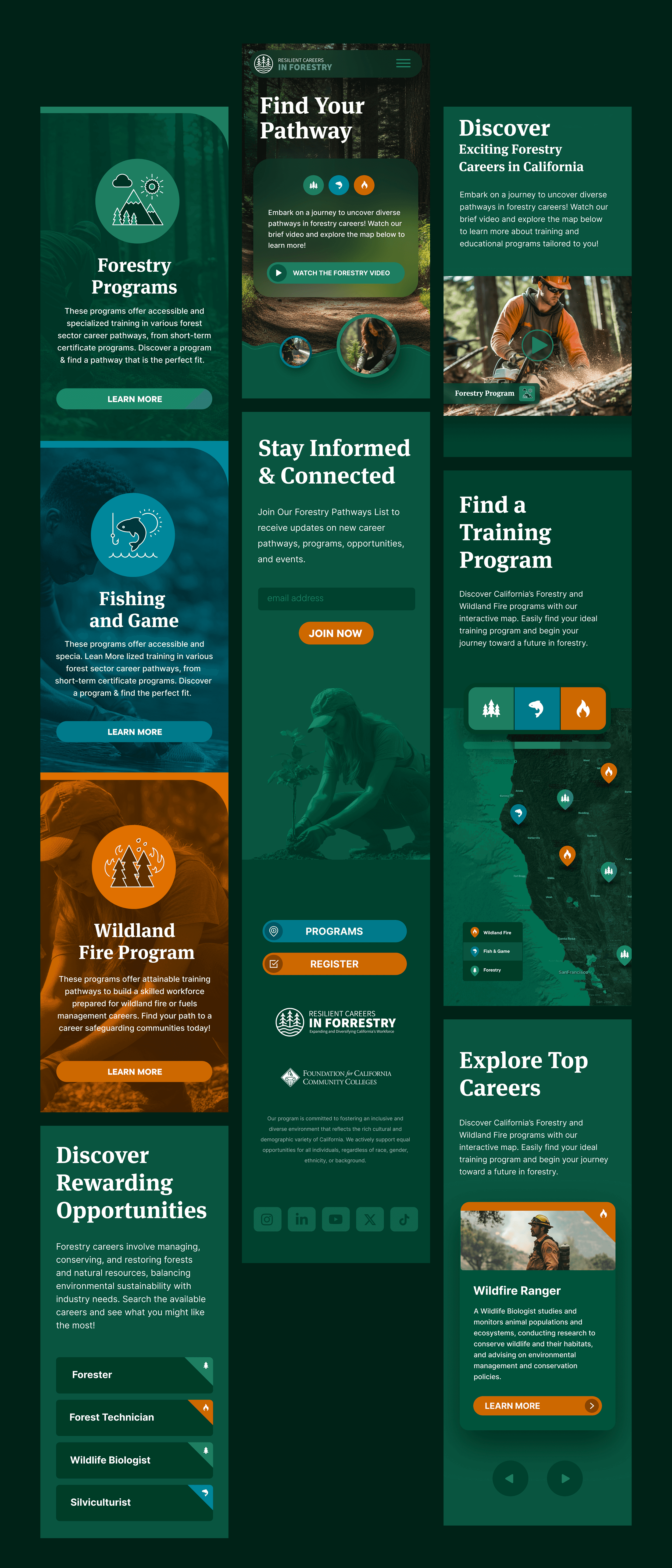 I designed a modern digital platform that brings all of California’s forestry programs, training options, and career pathways into one clear, interactive experience. The site features map-based exploration, streamlined information design, and a warm, nature-driven aesthetic that makes complex data easy to navigate. By blending accessibility with thoughtful visual design, the platform transforms scattered resources into a simple, inspiring tool that helps people quickly understand their options and move toward their next career step.
